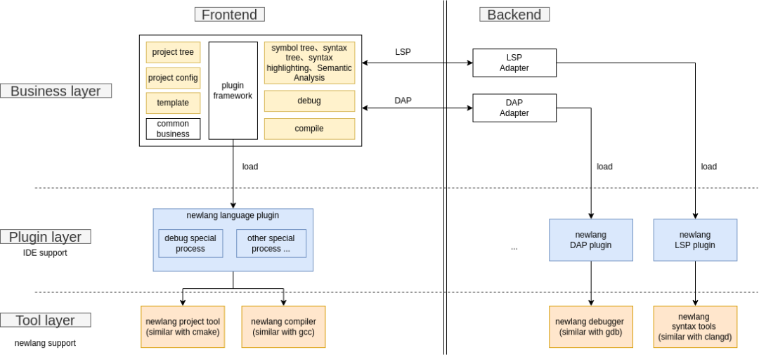 如上图所示,带颜色的模块均和特定的语言相关,对应通信中间件用的是 LSP(Language Server Protocol) 语言服务协议,可以基于该协议实现语法高亮、符号树、语法树等功能;调试相关的用的是 DAP(Debug Adapter Protocol) 调试适配协议,可以基于该协议实现被调试程序的启动、运行、断点命中、单步跳入、单步跳出等常用调试功能。