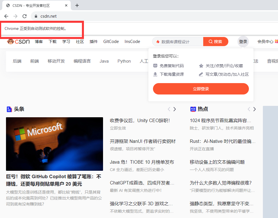 自动弹出谷歌浏览器,并且提示"Chrome 正受到自动测试软件的控制", 说明驱动配置OK。